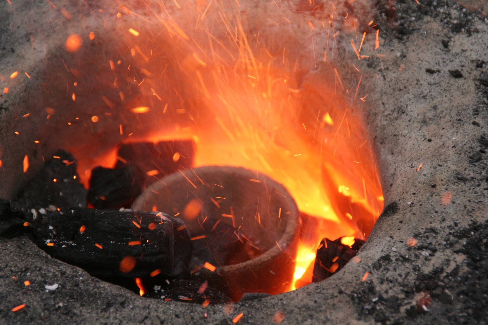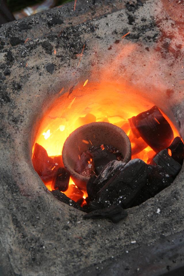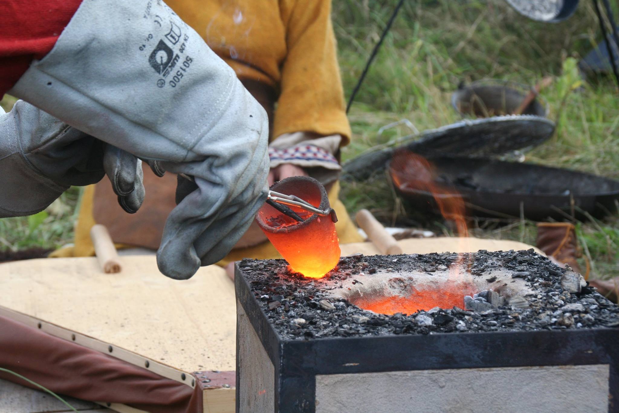 Der glühende Tiegel mit dem flüssigen Metall wird entnommen, die Schlacke und Holzkohlestückchen abgeschöpft und zügig gegossen